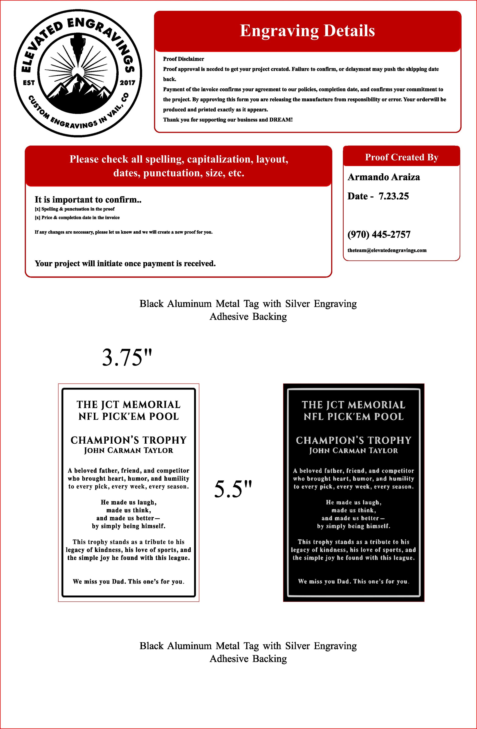 Because of the personalized nature of our products and services, items are not reusable after they have been engraved or customized. We do not offer returns once the custom design proof is approved and payment is received.